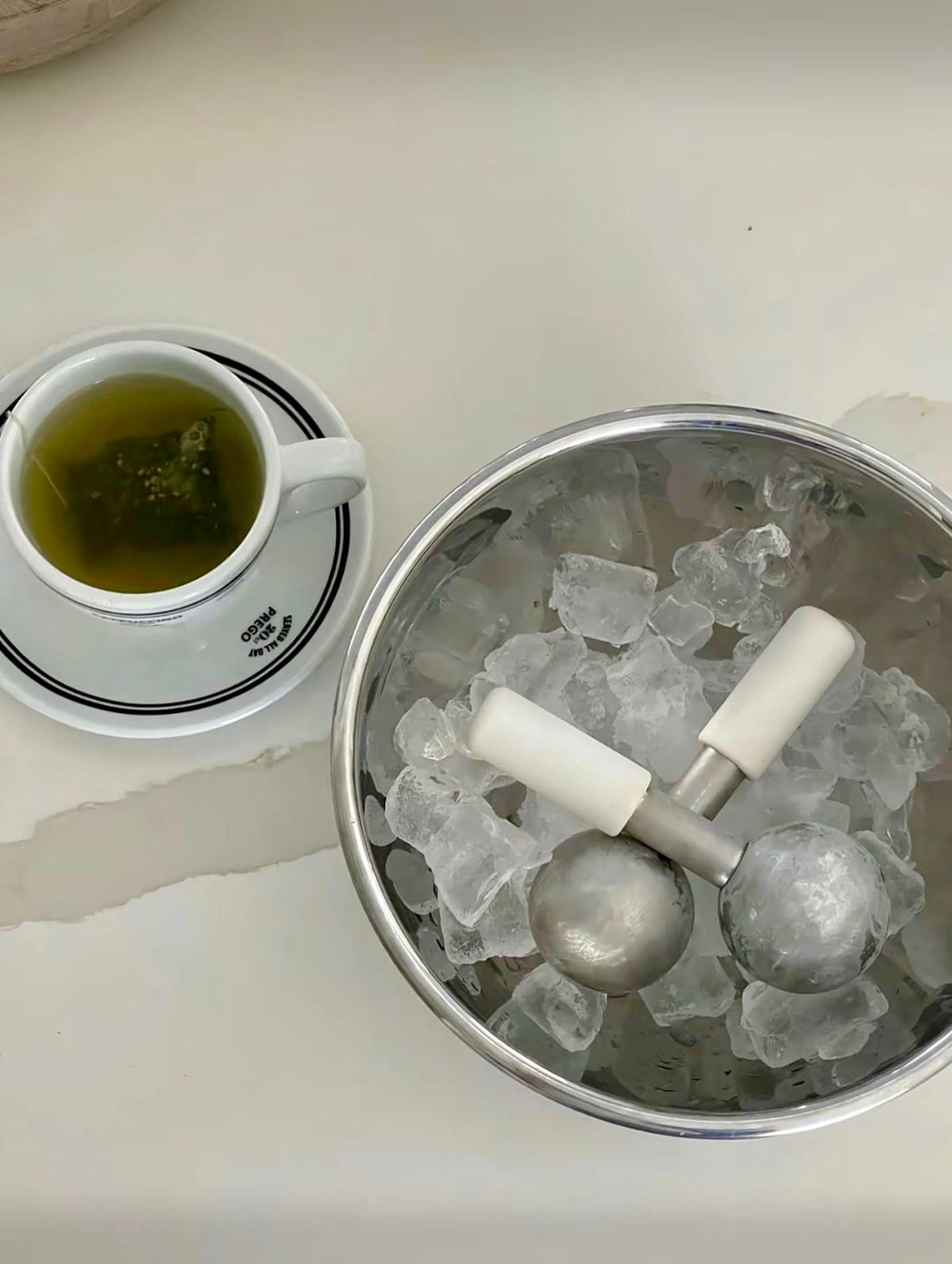 One of our go to morning skincare steps. Fill a large bowl with ice and water while you wash your face with your usual cleanser. Once the water temperature is icy, it's time to dunk. Submerge your face for 10 seconds and repeat 6 times with short breaks in between. Hold your breath, obviously, and if you don't like the sensation of water up your nose, use a swimmers nose clip. It's a simple step but one that will give amazing results, reduce puffiness, tighten skin, and calm inflammation.