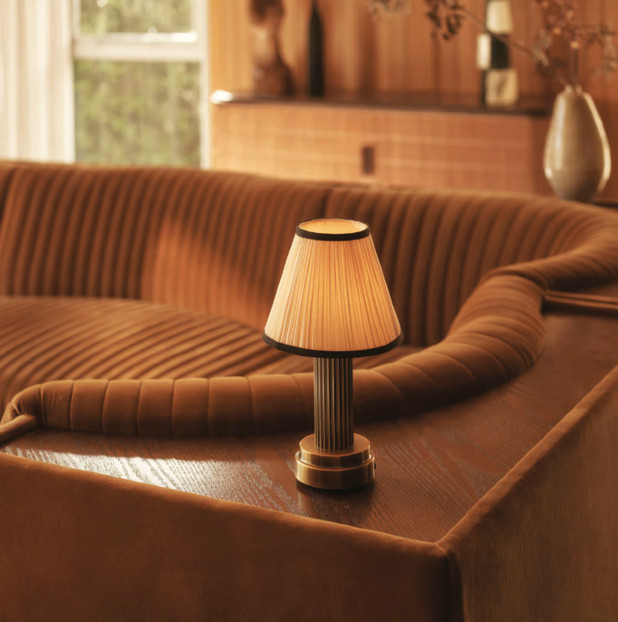 The brass finish feels luxe without being over the top, and the portability means you can use it on a dining table for dinners, move it to your bedside, take it outside for evenings on the terrace, wherever. It's rechargeable via USB, dimmable, and lasts for hours on a single charge.