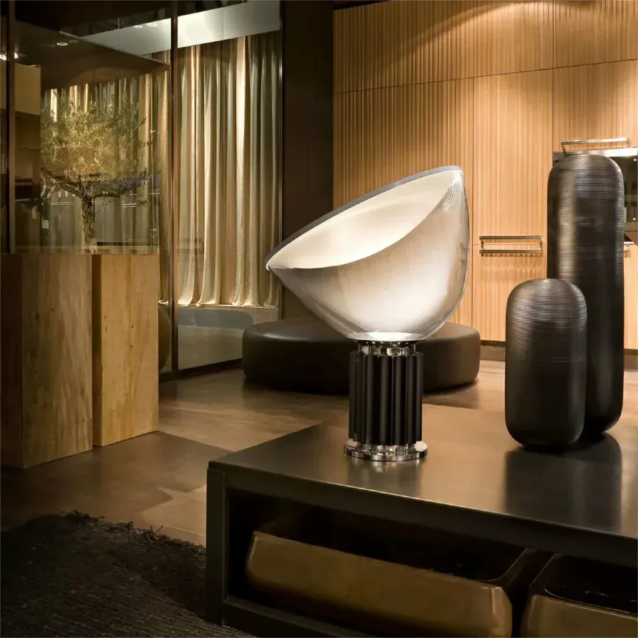 Achille and Pier Giacomo Castiglioni designed the Taccia table lamp with the concept of turning a ceiling lamp upside down. It's very much a statement piece (and for anyone who's into design, very much a piece of history) that works in modern spaces, minimalist interiors, or even more classic rooms. The kind of lamp that instantly elevates whatever it sits on - console table, sideboard, desk, bedside, anywhere really.