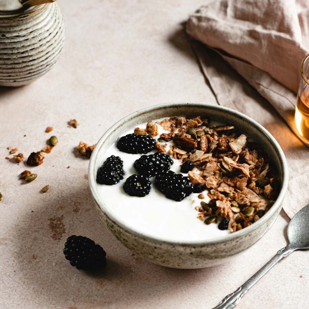 Toppings: Greek yoghurt, fresh berries, and a drizzle of honey