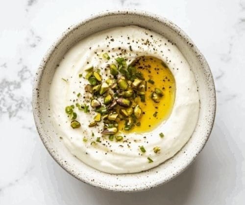 Tangy, salty and cooling. Blend Greek feta with a little Greek yoghurt or labneh until smooth. Drizzle with Palestinian olive oil, dust with smashed pistachios, and serve with warm flatbread or raw cucumber spears. Optional but excellent: crushed pistachios or a few torn mint leaves.