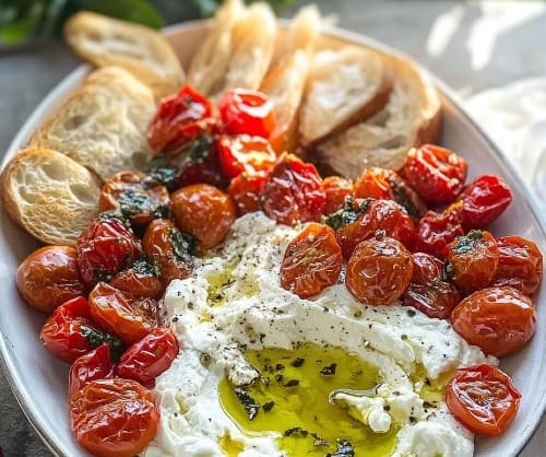 This is more of a spoonable topping than a dip, but it deserves a place on the table. Roast cherry tomatoes low and slow with garlic, thyme, and olive oil until jammy. Crush slightly with burrata and top with olive oil and black pepper. Serve with toasted sourdough or sturdy crackers.