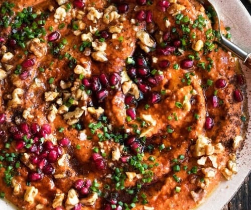 Char red peppers (or use jarred), then blend with toasted walnuts, olive oil, garlic, a spoon of pomegranate molasses, and a pinch of cumin. Finish with chopped chives, walnuts, pomegranate seeds and a glug of oil. Serve with seeded flatbread.