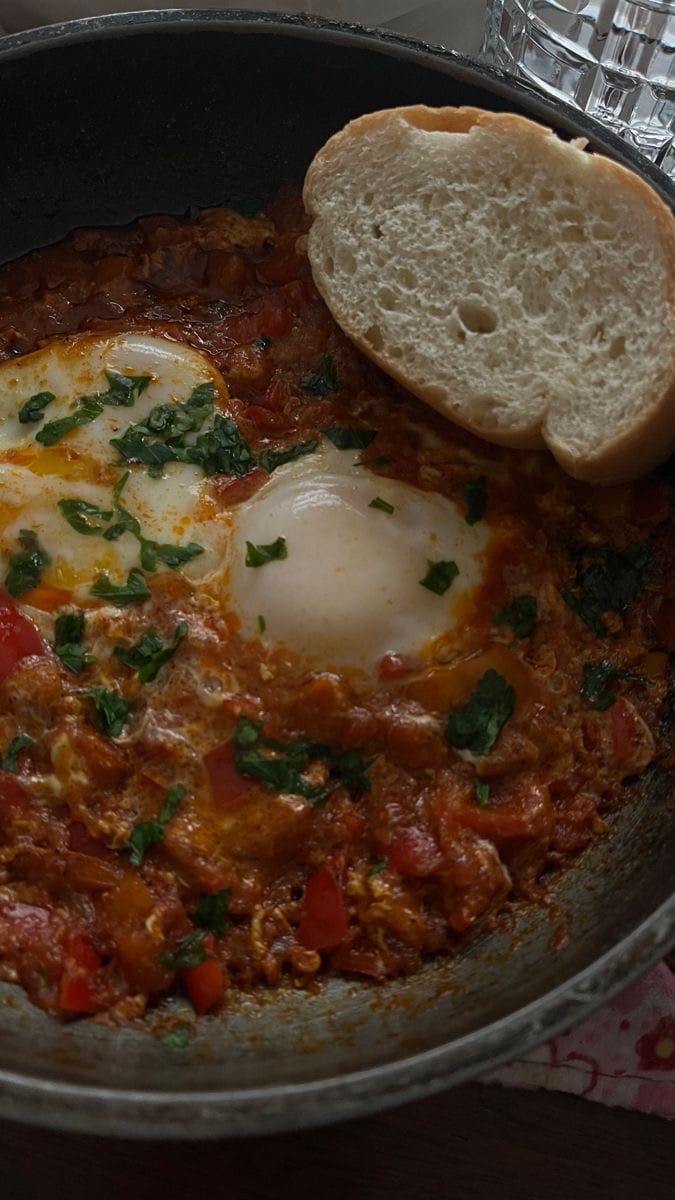 Dinner: Shakshuka because breakfast for lunch is also excellent. Eggs poached in spiced tomato sauce with peppers, onions, garlic, cumin, paprika. Serve with sourdough for dipping. It's comfort food that's stacked with flavour and feels fancy but takes 30 minutes.